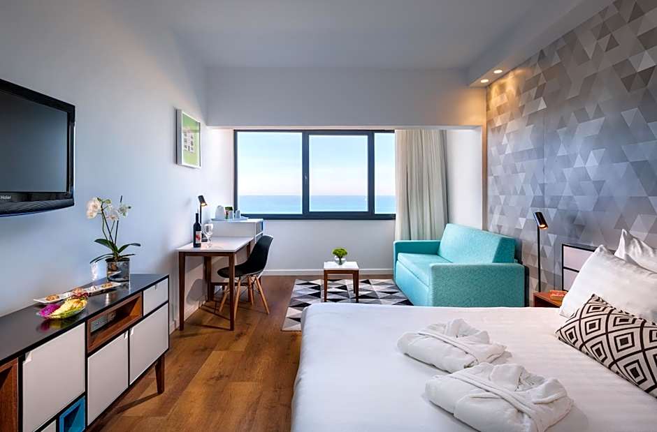Large room with seating area and panoramic views of the Mediterranean Sea and promenade. WiFi is free.